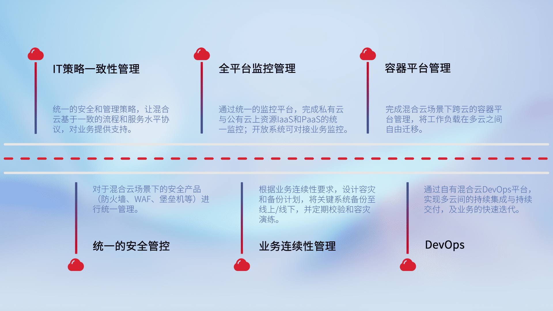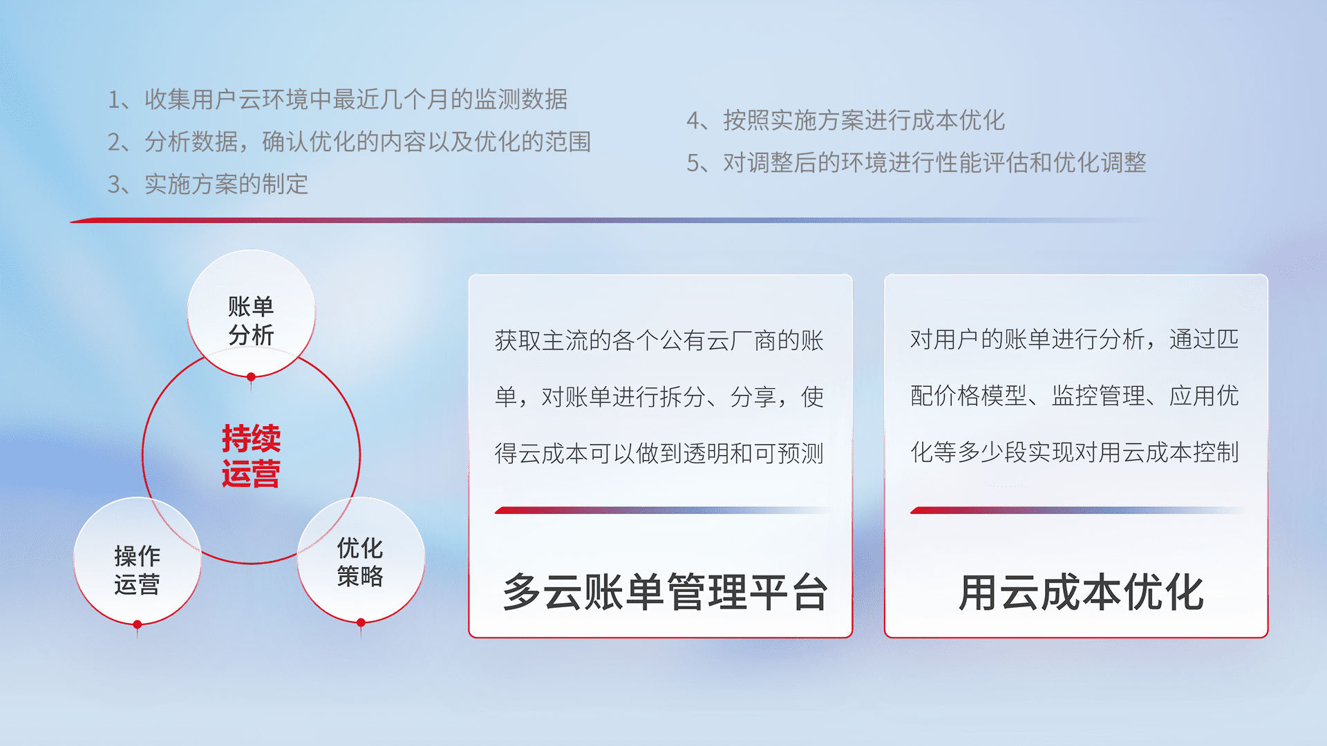 通过多云纳管,,以统一的资源数据模型把客户的云资源进行抽象和封装,,进而实现对多云资源的统一操作,,,保障云资源管理的可靠性、、、、稳定性与可用性。。。。量身定制化运维内容,,,,配置、、开发运维、、、补丁管理、、、、备份、、、、监控、、认证和访问管理、、、审计和日常巡检等,,,保障在用云过程中的可靠度,,,,稳定度以及高可用率。。。。