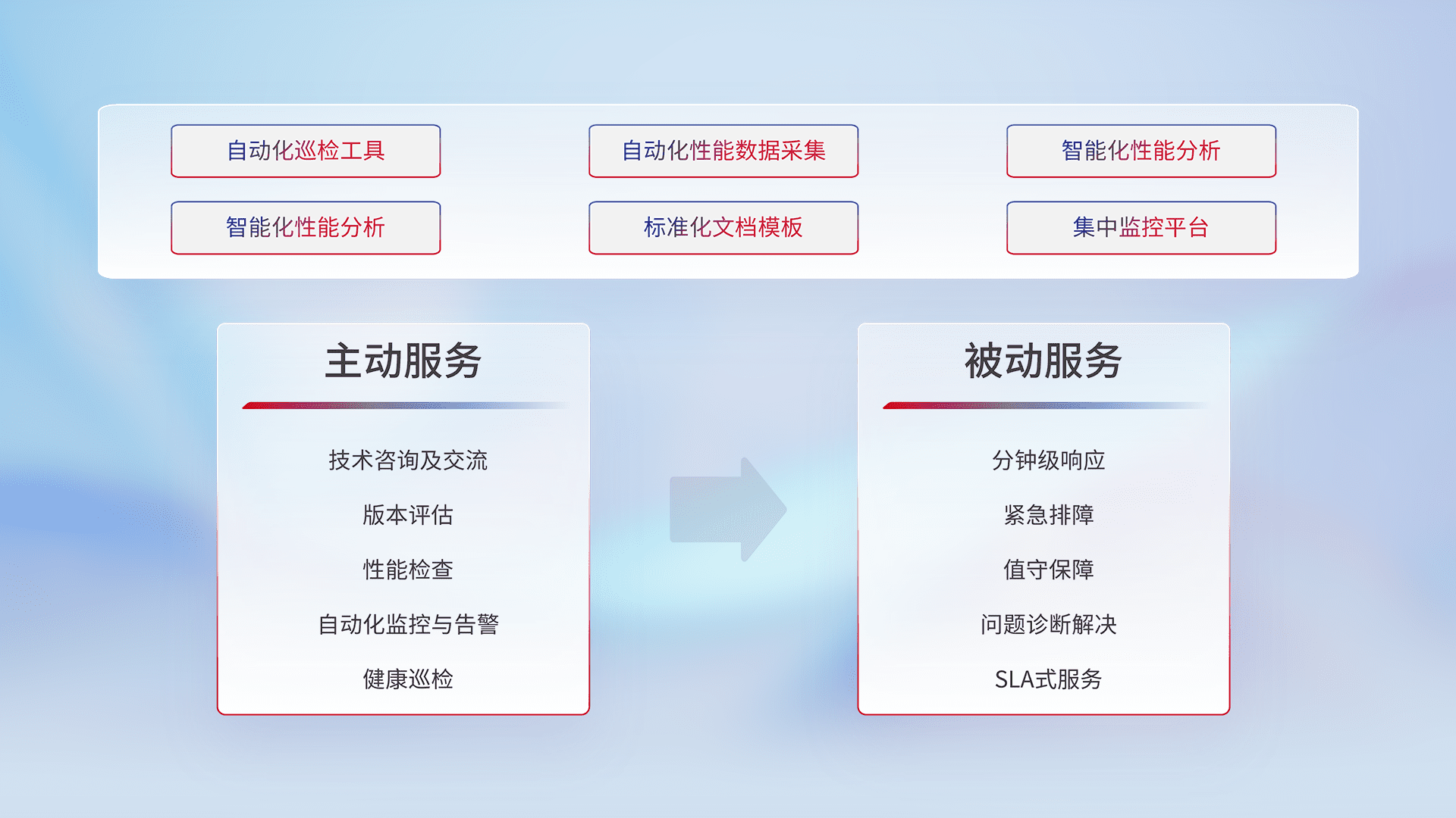 智能化工具和标准化文档,,,,保障服务质量,,,,提供主动服务(包含技术咨询、、、、版本评估、、、、性能检查、、、自动化监控与告警、、、、健康巡检)和被动服务包含(分钟级响应、、紧急排障、、值守保障、、问题诊断解决、、SLA服务)。。。。